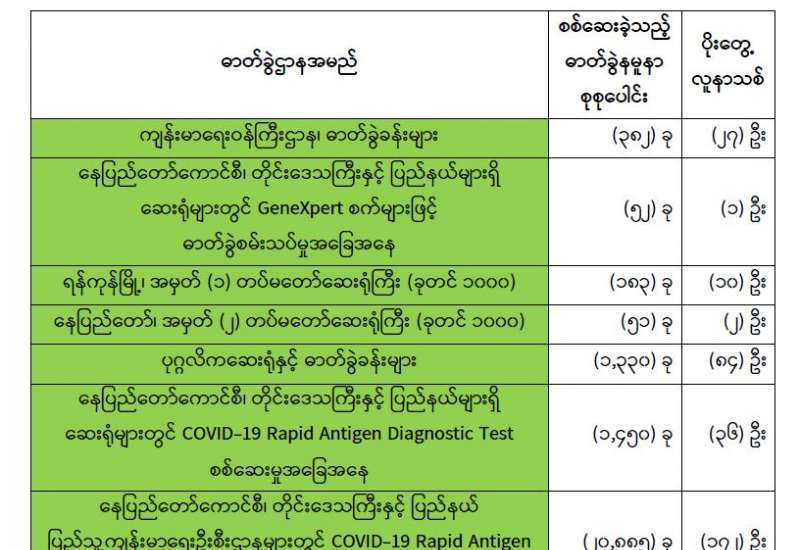 ကျန်းမာရေးဝန်ကြီးဌာနအနေဖြင့် နိုင်ငံအတွင်း ကူးစက်ဖြစ်ပွားနေသော COVID-19 ရောဂါ ကာကွယ်၊ ကုသ၊ ထိန်းချုပ်ရေးလုပ်ငန်းများကို အရှိန်အဟုန်မြှင့်ဆောင်ရွက်လျက်ရှိရာ ရောဂါထိန်းချုပ်ရေးလုပ်ငန်းများ အောင်မြင်နိုင်ရေးအတွက် ပြည်သူလူထုအနေဖြင့် ကျန်းမာရေးဝန်ကြီးဌာနမှ ထုတ်ပြန်ထားသော COVID-19 ရောဂါကာကွယ်ထိန်းချုပ်ရေး ဆိုင်ရာစည်းကမ်းများကို စနစ်တကျ လိုက်နာဆောင်ရွက်ရန်လိုအပ်ပြီး COVID-19 ကာကွယ်ဆေးထိုးနှံမှုခံယူခြင်းအား အထူးဂရုပြု ပူးပေါင်းဆောင်ရွက်ကြရန် လိုအပ်ပါသည်။