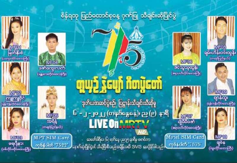 စိန်ရတုပြည်ထောင်စုနေ့ကို ဂုဏ်ပြုသောအားဖြင့် “တူယှဉ်နွှဲပျော်ဂီတပွဲတော်” သီချင်းဆိုပြိုင်ပွဲ ဒုတိယ အဆင့်ပွဲစဉ်၊ ပြဋ္ဌာန်းသီချင်းသီဆိုမှုကို ဖေဖော်ဝါရီ ၆ ရက် (တနင်္ဂနွေနေ့)ညတွင် မြန်မာ့ရုပ်မြင်သံကြားမှ တိုက်ရိုက် Live ရိုက်ကူးထုတ်လွှင့်မည်။