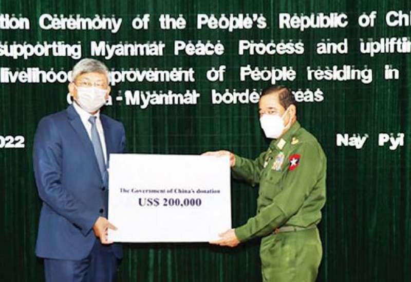 မြန်မာနိုင်ငံ၏ အပစ်အခတ်ရပ်စဲမှု၊ ငြိမ်းချမ်းရေးဖော်ဆောင်မှုတို့ကို တိုးမြှင့်ရန်နှင့်တရုတ်- မြန်မာ နယ်စပ် ဒေသ၌နေထိုင်သည့် ပြည်သူများ၏လူနေမှုဘဝ တိုးတက်ရေးတို့အတွက်ရည်ရွယ်၍ တရုတ်ပြည်သူ့သမ္မတ နိုင်ငံအစိုးရမှ နယ်စပ်ရေးရာဝန်ကြီးဌာနသို့ အမေရိကန်ဒေါ်လာ နှစ်သိန်း ပေးအပ်လှူဒါန်းခြင်းအခမ်းအနားကို ယနေ့နံနက်ပိုင်းတွင် နယ်စပ်ရေးရာဝန်ကြီးဌာနဝန်ကြီးရုံး အစည်းအဝေးခန်းမ၌ ကျင်းပသည်။