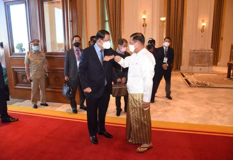 ပြည်ထောင်စုသမ္မတမြန်မာနိုင်ငံတော်၊ နိုင်ငံတော်စီမံအုပ်ချုပ်ရေးကောင်စီဥက္ကဋ္ဌ၊ နိုင်ငံတော် ဝန်ကြီးချုပ် ဗိုလ်ချုပ်မှူးကြီး မင်းအောင်လှိုင်၏ ဖိတ်ကြားချက် အရ ကမ္ဘောဒီးယားနိုင်ငံ ဝန်ကြီးချုပ် Samdech Akka Moha Sena Padei Techo HUN SEN ဉီးဆောင်သည့် အဆင့်မြင့် ကိုယ်စားလှယ်အဖွဲ့သည် မြန်မာနိုင်ငံသို့ ၂၀၂၂ ခုနှစ်၊ ဇန်နဝါရီလ ၇ ရက်မှ ၈ ရက်အထိ အလုပ်သဘောခရီးစဉ် လာရောက်ခဲ့သည်။