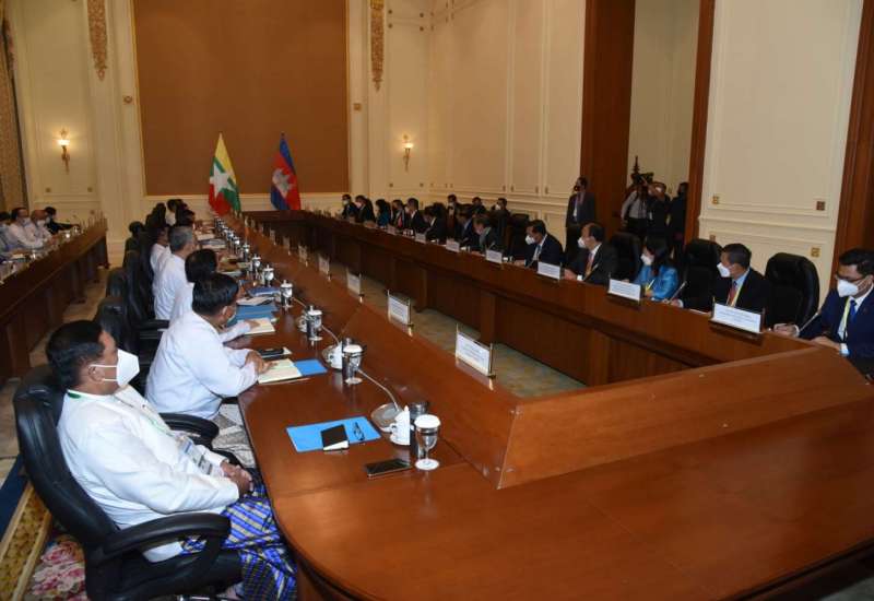 မြန်မာ - ကမ္ဘောဒီးယားနှစ်နိုင်ငံ တွေ့ဆုံဆွေးနွေးပွဲကို ယနေ့မွန်းလွဲပိုင်းတွင် နေပြည်တော်ရှိ နိုင်ငံတော်စီမံအုပ်ချုပ်ရေးကောင်စီဥက္ကဋ္ဌရုံး အစည်းအဝေးခန်းမ၌ ကျင်းပသည်