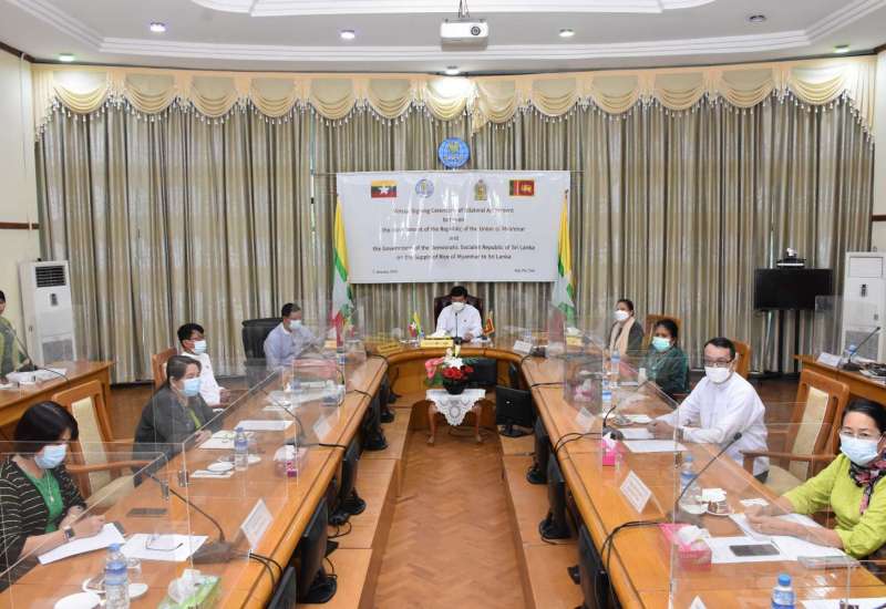 မြန်မာနိုင်ငံမှ သီရိလင်္ကာနိုင်ငံသို့ G to G အစီအစဉ်ဖြင့် ဆန်တင်ပို့ ရောင်းချနိုင်ရေးအတွက် မြန်မာနိုင်ငံ၊ စီးပွားရေးနှင့် ကူးသန်းရောင်းဝယ်ရေးဝန်ကြီးဌာနနှင့် သီရိလင်္ကာနိုင်ငံ၊ ကုန်သွယ်ရေးဝန်ကြီး ဌာနတို့အကြား နှစ်နိုင်ငံသဘောတူစာချုပ် (Bilateral Agreement) လက်မှတ်ရေးထိုးခြင်း အခမ်းအနားကို ယနေ့မွန်းလွဲ ၂ နာရီခွဲတွင်တွင် စီးပွားရေးနှင့် ကူးသန်း ရောင်းဝယ်ရေးဝန်ကြီးဌာန၊ အစည်းအဝေးခန်းမ၌ Virtual စနစ်ဖြင့် ကျင်းပရာ သီရိလင်္ကာနိုင်ငံ၊ ကုန်သွယ်ရေးဝန်ကြီး Dr. Bandula Gunawardhana နှင့် စီးပွားရေးနှင့် ကူးသန်းရောင်းဝယ်ရေး ဝန်ကြီးဌာန၊ ပြည်ထောင်စုဝန်ကြီး ဒေါက်တာပွင့်ဆန်းတို့ တက်ရောက်ပြီး အမှာစကားများ ပြောကြားသည်။