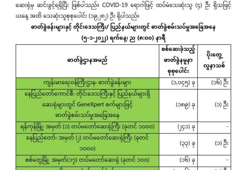 ကျန်းမာရေးဝန်ကြီးဌာနအနေဖြင့် နိုင်ငံအတွင်း ကူးစက်ဖြစ်ပွားနေသော COVID-19 ရောဂါ ကာကွယ်၊ ကုသ၊ ထိန်းချုပ်ရေးလုပ်ငန်းများကို အရှိန်အဟုန်မြှင့် ဆောင်ရွက်လျက်ရှိပါသည်။