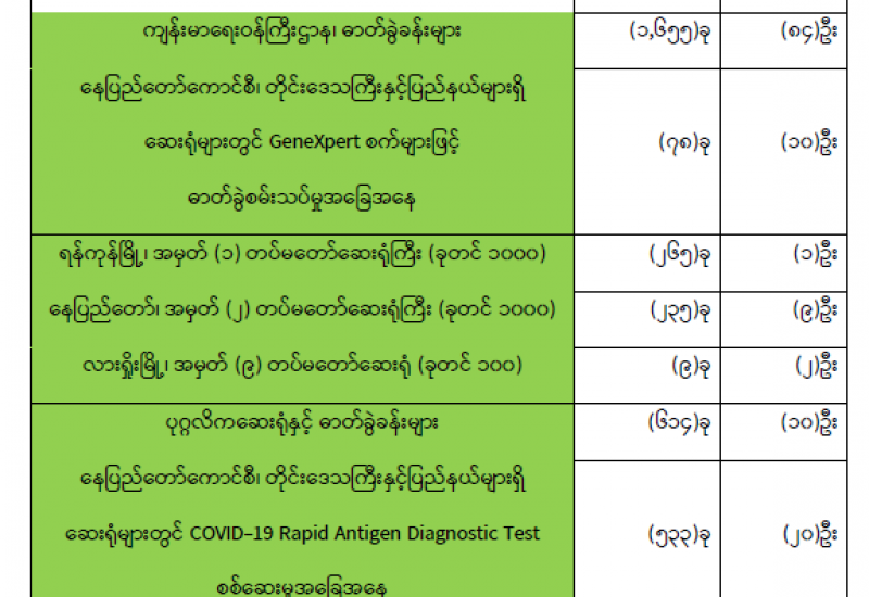 (၁၄-၁၂-၂၀၂၁) ရက်နေ့၊ ည (၈:၀၀) နာရီ ကျန်းမာရေးဝန်ကြီးဌာနအနေဖြင့် နိုင်ငံအတွင်း ကူးစက်ဖြစ်ပွားနေသော COVID-19 ရောဂါ ကာကွယ်၊ ကုသ၊ ထိန်းချုပ်ရေးလုပ်ငန်းများကို အရှိန်အဟုန်မြှင့်ဆောင်ရွက်လျက်ရှိပါသည်။