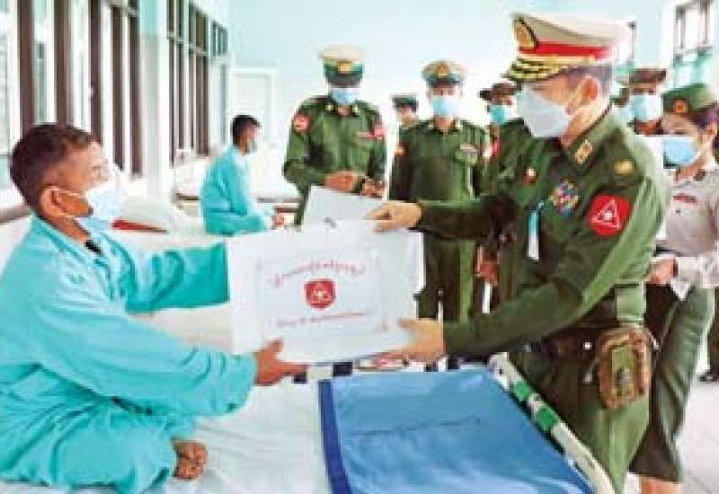 ရှမ်းပြည်နယ်(အရှေ့ပိုင်း) မိုင်းဆတ်မြို့ တပ်မတော်ဆေးရုံ၌ တက်ရောက် ကုသမှုခံယူလျက် ရှိသော အရာရှိ၊ စစ်သည်၊ မိသားစုများနှင့် ဒေသခံပြည်သူများအား ယနေ့နံနက်ပိုင်းတွင် တြိဂံဒေသတိုင်းစစ်ဌာနချုပ် တိုင်းမှူး ဗိုလ်မှူးချုပ် မျိုးမင်းထွန်းနှင့် အဖွဲ့ဝင်များက