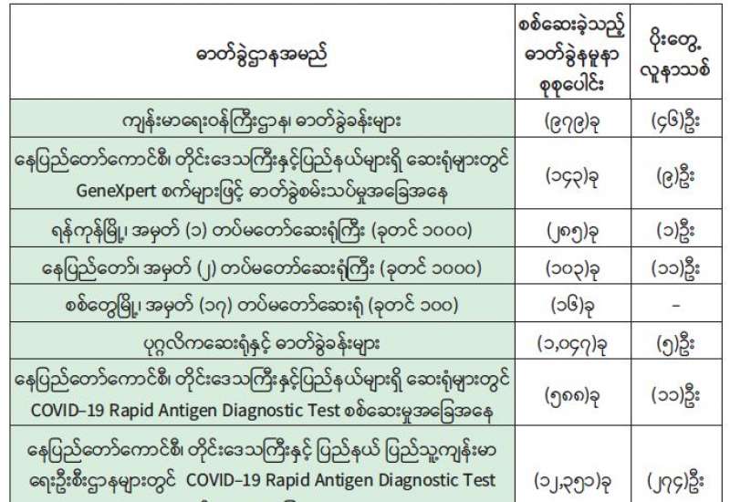 ကျန်းမာရေးဝန်ကြီးဌာနအနေဖြင့် နိုင်ငံအတွင်း ကူးစက်ဖြစ်ပွားနေသော ကိုဗစ်-၁၉ ရောဂါ ကာကွယ်၊ ကုသ၊ ထိန်းချုပ်ရေးလုပ်ငန်းများကို အရှိန်အဟုန်မြှင့် ဆောင်ရွက်လျက်ရှိပါသည်။