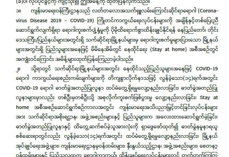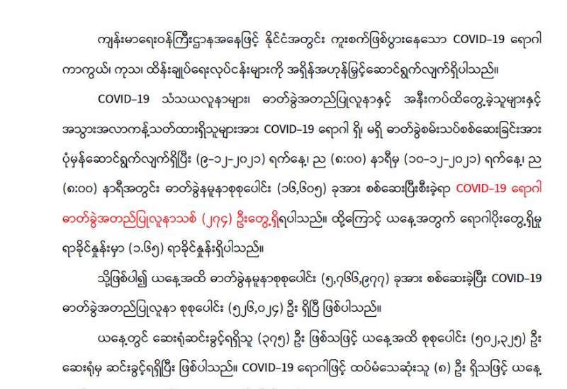 စီးပွားရေးနှင့် ကူးသန်းရောင်းဝယ်ရေးဝန်ကြီးဌာနအနေဖြင့် ကိုဗစ်-၁၉ ရောဂါ ကာကွယ်၊ ထိန်းချုပ်၊ ကုသရေးဆိုင်ရာပစ္စည်းများကိုလေကြောင်း၊ ရေကြောင်းနှင့်နယ်စပ်ကုန်သွယ်ရေး စခန်းများမှနှောင့်နှေးကြန့်ကြာမှုမရှိ တင်သွင်းနိုင်ရေးအတွက် အချိန်နှင့်တစ်ပြေးညီ စီစဉ် ဆောင်ရွက်ပေးလျက်ရှိရာ ယနေ့တွင် အပြည်ပြည်ဆိုင်ရာ ဆိပ်ကမ်းများနှင့် ချင်းရွှေဟော် ကုန်သွယ်ရေးစခန်း၊ မြဝတီကုန်သွယ်ရေးဇုန်နှင့် ကျိုင်းတုံပို့ကုန်သွင်းကုန်ရုံးတို့မှ ကုမ္ပဏီ (၃)ခု၊ ယာဉ်စီးရေ (၇)စီးဖြင့် အောက်ဆီဂျင် (အရည်) Bowser ယာဉ် (၁)စီးဖြင့် တန် (၂၀) နှင့် နှာခေါင်းစည်း (Mask) (၂၉) တန်တို့ကို တင်သွင်းခဲ့သည်။ အောက်ဆီဂျင်အရည် (Bowser) ယာဉ်(၁)စီးမှာ မြဝတီကုန်သွယ်ရေးဇုန်မှ ရန်ကုန်မြို့သို့ ဖြစ်ကြောင်း သိရသည်။