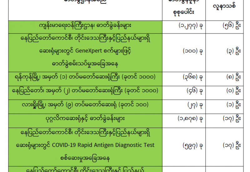 ကျန်းမာရေးဝန်ကြီးဌာနအနေဖြင့် နိုင်ငံအတွင်း ကူးစက်ဖြစ်ပွားနေသော COVID-19 ရောဂါ ကာကွယ်၊ ကုသ၊ ထိန်းချုပ်ရေးလုပ်ငန်းများကို အရှိန်အဟုန်မြှင့်ဆောင်ရွက်လျက်ရှိရာ ရောဂါ ထိန်းချုပ်ရေးလုပ်ငန်းများ အောင်မြင်နိုင်ရေးအတွက် ပြည်သူလူထုအနေဖြင့် ကျန်းမာရေး ဝန်ကြီးဌာနမှ ထုတ်ပြန်ထားသော COVID-19 ရောဂါကာကွယ်ထိန်းချုပ်ရေးဆိုင်ရာ စည်းကမ်းများကို စနစ်တကျ လိုက်နာဆောင်ရွက်ရန် လိုအပ်ပြီး COVID-19 ကာကွယ်ဆေးထိုးနှံ မှုခံယူခြင်းအား အထူးဂရုပြု ပူးပေါင်းဆောင်ရွက်ကြရန် လိုအပ်ပါသည်။