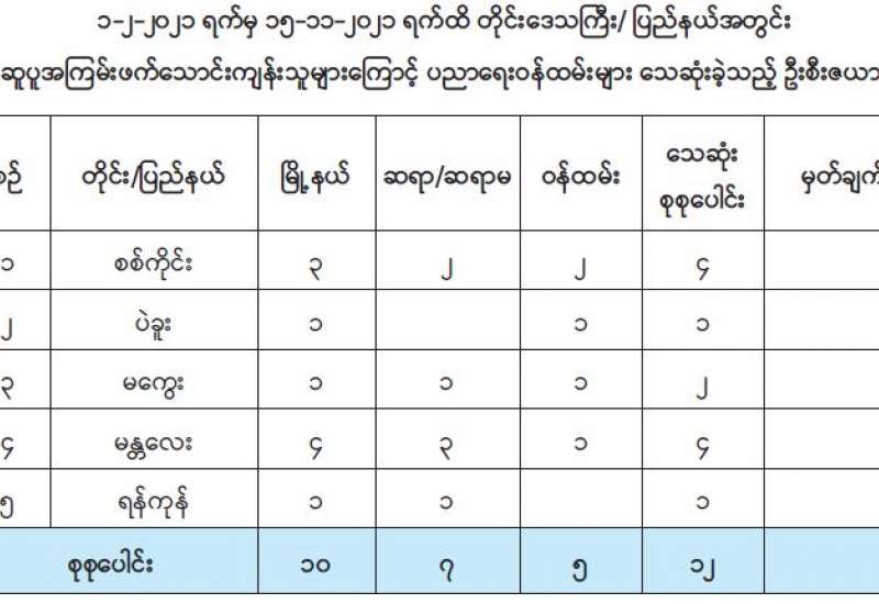 ပြည်ပနိုင်ငံများမှ ဝင်ရောက်လာသည့် မြန်မာနိုင်ငံသားများကိုနယ်စပ်ဂိတ် အသီးသီးတွင်လက်ခံဆောင်ရွက်ပေးလျက်ရှိရာ နိုဝင်ဘာ ၁၆ ရက်တွင် ရှမ်းပြည်နယ် (မြောက်ပိုင်း)၊ ချင်းရွှေဟော်မြို့သို့ ပြန်လည်ဝင်ရောက်လာသူ အမျိုးသား ၆၇ ဦး၊ အမျိုးသမီး ၂၄ ဦး၊ စုစုပေါင်း ၉၁ ဦးနှင့် လောက်ကိုင်မြို့သို့ပြန်လည်ဝင်ရောက်လာသူ မျိုးသား ၃ ဦး၊ အမျိုးသမီး ၂ ဦး စုစုပေါင်း ၅ ဦးတို့ကို အသီးသီးလက်ခံခဲ့ကြသည်။