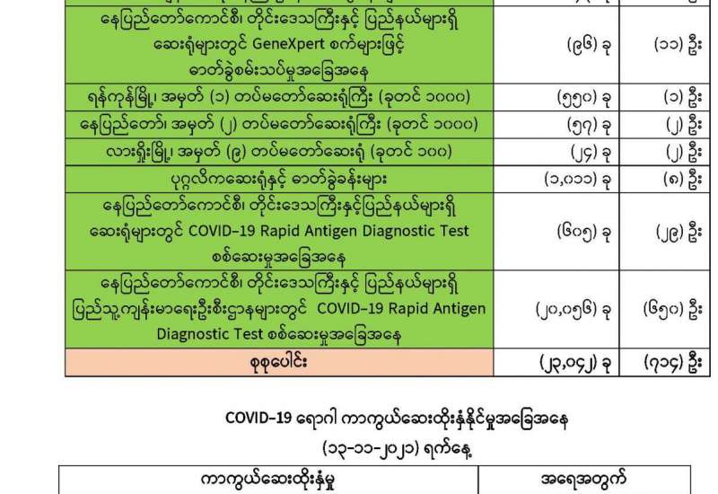 ကျန်းမာရေးဝန်ကြီးဌာနအနေဖြင့် နိုင်ငံအတွင်း ကူးစက်ဖြစ်ပွားနေသော COVID-19 ရောဂါ ကာကွယ်၊ ကုသ၊ ထိန်းချုပ်ရေး လုပ်ငန်းများကို အရှိန်အဟုန်မြှင့်ဆောင်ရွက်လျက်ရှိရာ ရောဂါ ထိန်းချုပ်ရေးလုပ်ငန်းများ အောင်မြင်နိုင်ရေးအတွက် ပြည်သူလူထု အနေဖြင့် ကျန်းမာရေးဝန်ကြီးဌာနမှ ထုတ်ပြန်ထားသော COVID-19 ရောဂါကာကွယ်ထိန်းချုပ်ရေးဆိုင်ရာ စည်းကမ်းများကို စနစ်တကျ လိုက်နာဆောင်ရွက်ရန်လိုအပ်ပြီး COVID-19 ကာကွယ်ဆေး ထိုးနှံမှုခံယူခြင်းအား အထူးဂရုပြု ပူးပေါင်းဆောင်ရွက် ကြရန် လိုအပ်ပါသည်။