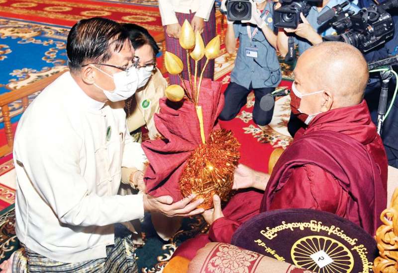 ပြည်ထောင်စုသမ္မတမြန်မာနိုင်ငံတော်၊ နိုင်ငံတော်စီမံအုပ်ချုပ်ရေးကောင်စီ ၂၀၂၁ ခုနှစ် ကထိန်သင်္ကန်း ဆက်ကပ်လှူဒါန်းပွဲ အခမ်းအနားကို ယနေ့နံနက်ပိုင်းတွင် နေပြည်တော်ရှိ ဥပ္ပါတသန္တိစေတီတော်၊ သာသနာ့မဟာဗိမာန်တော်၌ ကျင်းပပြုလုပ်ရာ နိုင်ငံတော်စီမံအုပ်ချုပ်ရေး ကောင်စီဥက္ကဋ္ဌ နိုင်ငံတော်ဝန်ကြီးချုပ် ဗိုလ်ချုပ်မှူးကြီး မင်းအောင်လှိုင်နှင့် ဇနီးဒေါ်ကြူကြူလှတို့ တက်ရောက်၍ ကထိန်လျာသင်္ကန်းနှင့် လှူဖွယ်ပစ္စည်းများ ဆက်ကပ်လှူဒါန်းသည်။