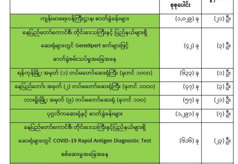 ကျန်းမာရေးဝန်ကြီးဌာနအနေဖြင့် နိုင်ငံအတွင်း ကူးစက်ဖြစ်ပွားနေသော COVID-19 ရောဂါ ကာကွယ်၊ ကုသ၊ ထိန်းချုပ်ရေး လုပ်ငန်းများကို အရှိန်အဟုန်မြှင့် ဆောင်ရွက်လျက်ရှိပါသည်။