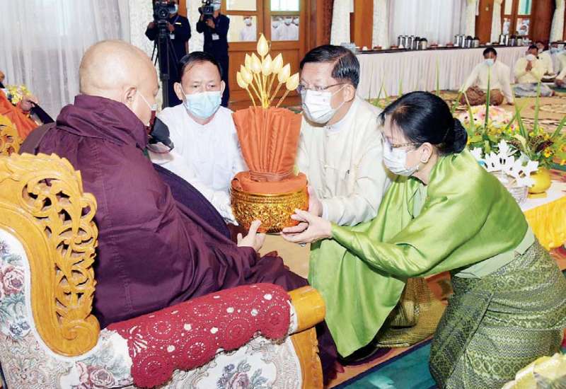 ကာကွယ်ရေးဦးစီးချုပ်ရုံး (ကြည်း၊ ရေ၊ လေ) မိသားစုများ၏ (၁၁)ကြိမ်မြောက် မဟာဘုံကထိန် အလှူတော်မင်္ဂလာအခမ်းအနားကို ယနေ့နံနက်ပိုင်းတွင် ကာကွယ်ရေး ဦးစီးချုပ်ရုံး(ကြည်း) အနော်ရထာခန်းမ၌ ကျင်းပပြုလုပ်ရာ နိုင်ငံတော်စီမံအုပ်ချုပ်ရေး ကောင်စီဥက္ကဋ္ဌ တပ်မတော် ကာကွယ်ရေးဦးစီးချုပ် ဗိုလ်ချုပ်မှူးကြီး မင်းအောင်လှိုင်နှင့် ဇနီး ဒေါ်ကြူကြူလှတို့ တက်ရောက်၍ ကထိန်လျာသင်္ကန်းနှင့် လှူဖွယ်ပစ္စည်းများ ဆက်ကပ်လှူဒါန်းသည်။