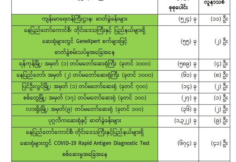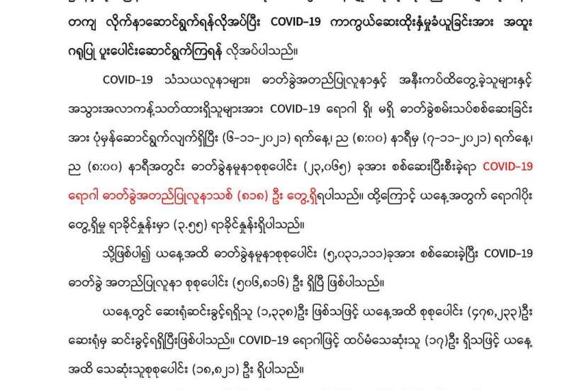 ကျန်းမာရေးဝန်ကြီးဌာနအနေဖြင့် နိုင်ငံအတွင်း ကူးစက်ဖြစ်ပွားနေသော COVID-19 ရောဂါ ကာကွယ်၊ ကုသ၊ ထိန်းချုပ်ရေးလုပ်ငန်းများကို အရှိန်အဟုန်မြှင့်ဆောင်ရွက်လျက်ရှိပါသည်။