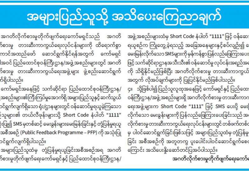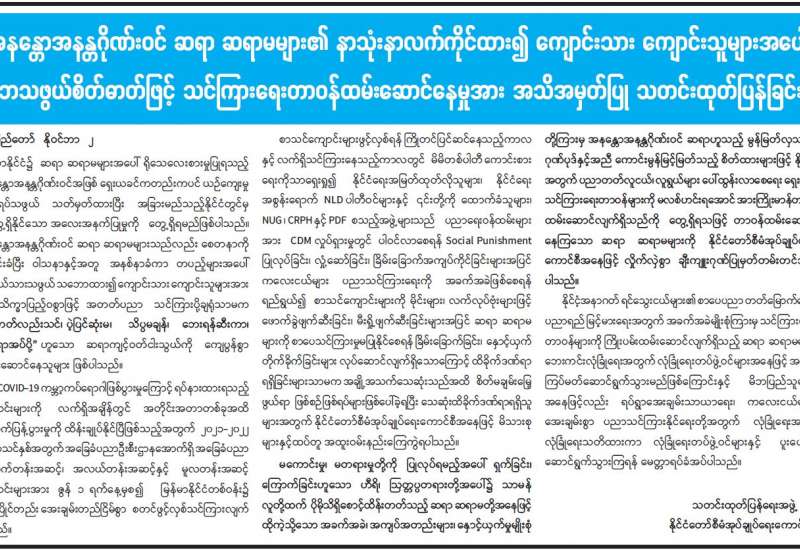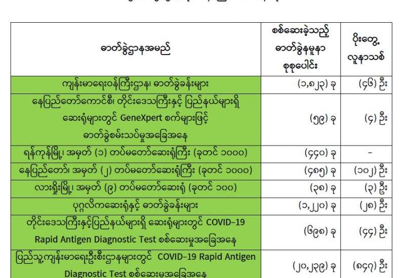 ကျန်းမာရေးဝန်ကြီးဌာနအနေဖြင့် နိုင်ငံအတွင်း ကူးစက်ဖြစ်ပွားနေသော COVID-19 ရောဂါ ကာကွယ်၊ ကုသ၊ ထိန်းချုပ်ရေးလုပ်ငန်းများကို အရှိန်အဟုန်မြှင့်ဆောင်ရွက်လျက်ရှိရာ ရောဂါ ထိန်းချုပ်ရေးလုပ်ငန်းများ အောင်မြင်နိုင်ရေးအတွက် ပြည်သူလူထုအနေဖြင့် -