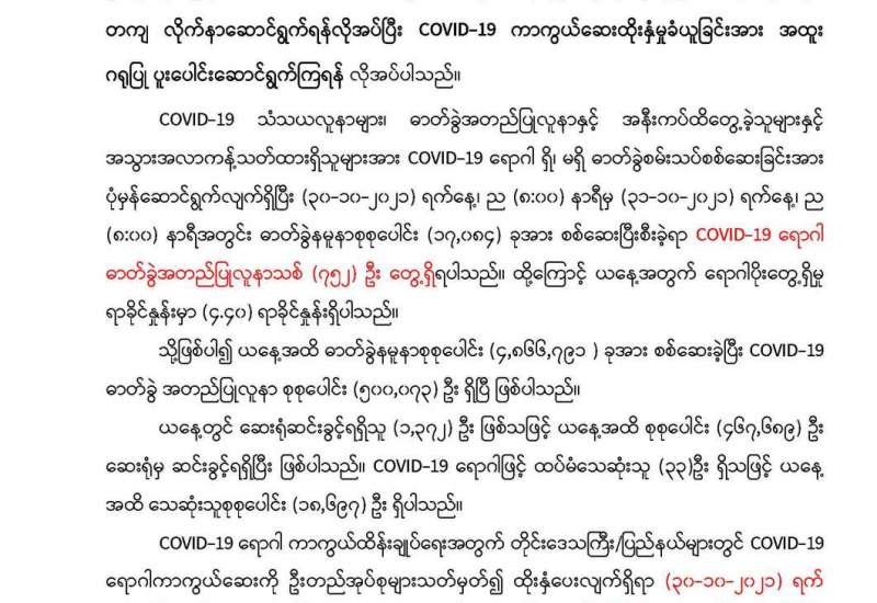 မြန်မာနိုင်ငံအတွင်း ကိုဗစ်-၁၉ ရောဂါ ကူးစက်ဖြစ်ပွားမှုကို ထိန်းချုပ်နိုင်ရေး ဆောင်ရွက်ရာတွင် နိုင်ငံတကာမှ လေကြောင်းခရီးစဉ်များဖြင့် ခရီးသည်များ ဝင်ရောက်လာမှုကို ကန့်သတ် ထိန်းချုပ်နိုင်ရေးမှာ များစွာ အရေးပါသဖြင့် ကျန်းမာရေးဝန်ကြီးဌာနက (၂၉-၃-၂၀၂၀) ရက်နေ့တွင် ထုတ်ပြန်ခဲ့သော နိုင်ငံတကာ ခရီးသည်တင် လေကြောင်းခရီးစဉ်များ (International Commercial Passenger Flights) မြန်မာနိုင်ငံသို့ ပျံသန်းဆင်းသက်ခြင်းကို ယာယီကန့်သတ်ခြင်းဆိုင်ရာ ညွှန်ကြားချက် (Temporary Measures to Prevent Importation of COVID-19 to Myanmar through Air Travel) ကို Temporary Measures to Prevent Importation of COVID-19 to Myanmar through Air Travel Issue-2 အဖြစ် (၃၁-၁၂-၂၀၂၀) ရက်နေ့တွင် ပြင်ဆင်ထုတ်ပြန်ခဲ့ပြီး သက်ရောက်မှုကာလကို ကိုဗစ်-၁၉ ကာကွယ်၊ ထိန်းချုပ်၊ ကုသရေး ဗဟိုကော်မတီ၏ ခွင့်ပြုချက်ဖြင့် (၃၁-၁၀-၂၀၂၁) ရက်နေ့၊ မြန်မာစံတော်ချိန် (၂၃:၅၉) နာရီအထိ သတ်မှတ်ခဲ့ပါသည်။