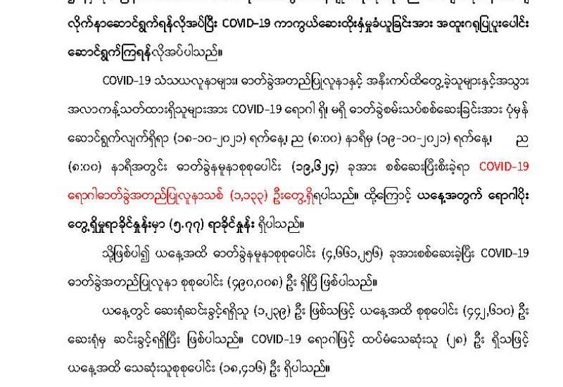 ကိုဗစ်-၁၉ ရောဂါ ကာကွယ်၊ ထိန်းချုပ်၊ ကုသရေး ဆောင်ရွက်ရာတွင် ကာကွယ်ဆေးထိုးနှံခြင်းသည် အဓိကအခန်းကဏ္ဍတွင် ပါဝင်သည့် လုပ်ငန်းတစ်ရပ် ဖြစ်သောကြောင့် တိုင်းဒေသကြီးနှင့် ပြည်နယ်အသီးသီးတို့၌ သံဃာတော်များ၊ သာသနာနွယ်ဝင်သီလရှင်များ၊ ဘာသာရေးခေါင်းဆောင်များ အပါအဝင် လူမျိုးမရွေး ဘာသာမရွေး အသက်(၅၅)နှစ်အထက် ဒေသခံပြည်သူများ၊ အကျဉ်းသား၊ အကျဉ်းသူများ၊ မသန်စွမ်းသူများ၊ တိုင်းရင်းသားလက်နက်ကိုင်အဖွဲ့များ၊ နာတာရှည်ရောဂါအခံရှိ သူများ၊ ကယ်ဆယ်ရေးစခန်းများ၊ ယာယီတိုက်ပွဲရှောင်စခန်းများအတွင်းရှိ ပြည်သူများ၊ အသက်(၁၂) နှစ်အထက် အခြေခံပညာအလယ်တန်းနှင့် အထက်တန်းအဆင့် ကျောင်းသား၊ ကျောင်းသူများ စသည့် ဦးတည်အုပ်စုများ သတ်မှတ်၍ တပ်မတော်မှ ဆေးအဖွဲ့များ၊ ပြည်သူ့ဆေးရုံများမှ ဆရာဝန်များ၊ သူနာပြုများ၊ ကျန်းမာရေး ဝန်ထမ်းများနှင့် စေတနာ့ဝန်ထမ်းများက ကာကွယ်ဆေးထိုးခြင်း လုပ်ငန်းများကို အင်တိုက်အားတိုက် ဆောင်ရွက်ပေးလျက်ရှိသည်။