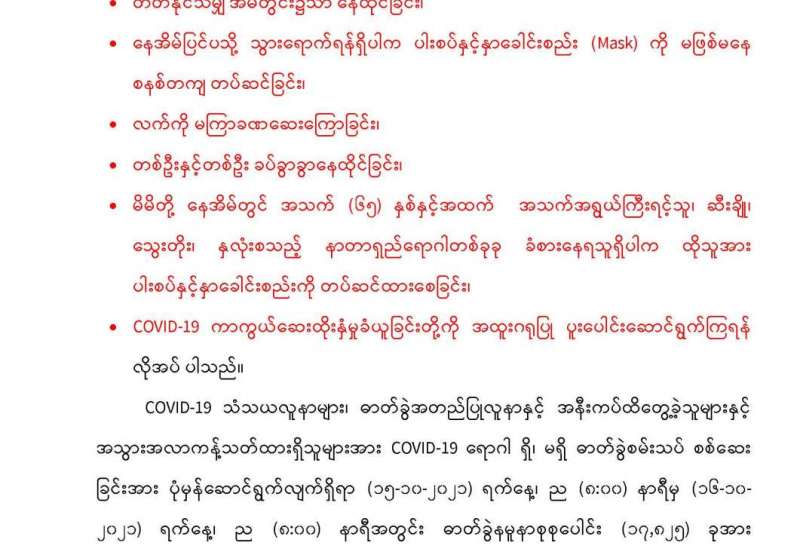 ကိုဗစ်-၁၉ ရောဂါအတည်ပြု လူနာများနှင့် သီးသန့်စောင့်ကြည့်ရမည့် သူများထားရှိရန်အတွက် တိုင်းစစ်ဌာနချုပ် နယ်မြေအသီးသီးရှိ တပ်မတော်ဆေးရုံများ၊ နယ်မြေခံသင်တန်းကျောင်းများ၊ စစ်ကြောရေးနှင့် တည်းခိုရေးစခန်းများ၌ စနစ်တကျလက်ခံ၍ ကျန်းမာရေးစောင့်ရှောက်မှုလုပ်ငန်းများ ဆောင်ရွက်ပေးလျက်ရှိသည်။ ထို့ပြင် ကျန်းမာရေးဝန်ကြီးဌာနနှင့် အခြားဌာနဆိုင်ရာ တာဝန်ရှိ သူများ၊ ပရဟိတအဖွဲ့အစည်းများ၊ တာဝန်သိပြည်သူများနှင့် ပူးပေါင်း၍လည်း သက်ဆိုင်ရာ မြို့နယ်များ၌ Quarantine Center များ ဖွင့်လှစ်ဆောင်ရွက် ပေးလျက်ရှိသည်။