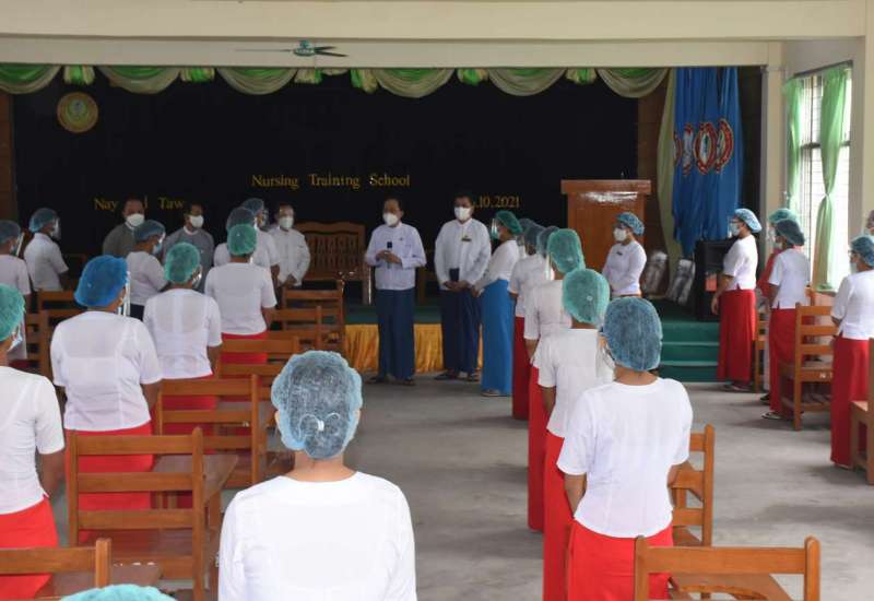 ကျန်းမာရေးဝန်ကြီးဌာန၊ ပြည်ထောင်စုဝန်ကြီး ဒေါက်တာသက်ခိုင်ဝင်းနှင့် နေပြည်တော် ကောင်စီ ဥက္ကဋ္ဌ၊ ဒေါက်တာ မောင်မောင်နိုင်၊ ကျန်းမာရေးဝန်ကြီးဌာန၊ ဒုတိယဝန်ကြီး ဒေါက်တာအေးထွန်း၊ နေပြည်တော်ကောင်စီဝင် ဗိုလ်မှူးကြီး မင်းနောင်တို့သည် ယနေ့ နံနက်ပိုင်းတွင် နေပြည်တော် (ခုတင်-၁၀၀၀)ဆေးရုံဝင်းအတွင်းရှိ သူနာပြုသင်တန်းကျောင်းသို့ သွားရောက်၍ သူနာပြုသင်တန်း တက်ရောက်လျက်ရှိသည့် သင်တန်းသား/သင်တန်းသူများကို တွေ့ဆုံ၍ ရင်းရင်းနှီးနှီး နှုတ်ဆက် အားပေးစကား ပြောကြားသည်။