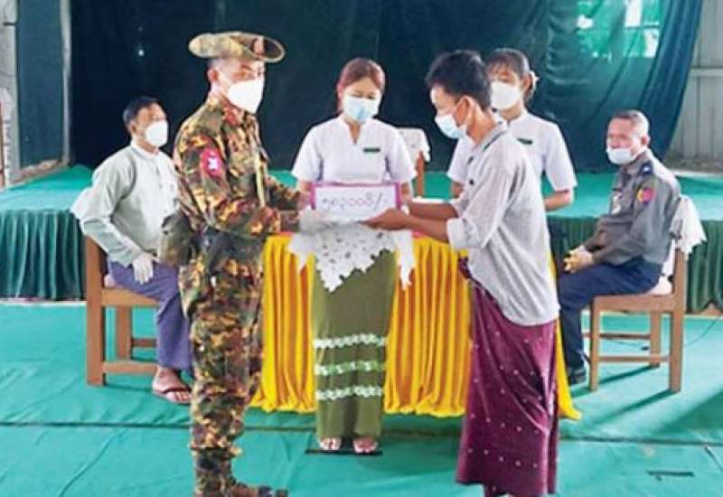 ချင်းပြည်နယ် ပလက်ဝမြို့နယ်အတွင်းရှိ ကျေးရွာ များမှ တိုက်ပွဲရှောင်ပြည်သူများ နေရပ်ပြန်နိုင်ရေး အတွက် နေအိမ်အသစ် ဆောက်လုပ်ခြင်းနှင့် နေအိမ်များ ပြန်လည်ပြုပြင်ရန် ထောက်ပံ့ငွေများ ပေးအပ်ခြင်းကို အောက်တိုဘာ ၁၂ ရက် နံနက်ပိုင်းတွင် ပလက်ဝမြို့ မြို့မရပ်ရှိ အမှတ်(၁) အခြေခံပညာ အထက်တန်းကျောင်း သင်ခန်းမ၌ ပြုလုပ်ရာ အနောက်ပိုင်းတိုင်းစစ်ဌာနချုပ်၊ နယ်မြေခံတပ်မှ တာဝန်ရှိသူများ၊ မြို့နယ်စီမံအုပ်ချုပ်ရေးအဖွဲ့ဝင်များ၊ ဌာနဆိုင်ရာတာဝန်ရှိသူများနှင့် တိုက်ပွဲရှောင် ပြည်သူများ တက်ရောက်ကြသည်။