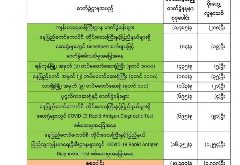 ကျန်းမာရေးဝန်ကြီးဌာနအနေဖြင့် နိုင်ငံအတွင်း ကူးစက်ဖြစ်ပွားနေသော COVID-19 ရောဂါ ကာကွယ်၊ ကုသ၊ ထိန်းချုပ်ရေး လုပ်ငန်းများကို အရှိန်အဟုန်မြှင့်ဆောင်ရွက်လျက်ရှိရာ ရောဂါ ထိန်းချုပ်ရေးလုပ်ငန်းများ အောင်မြင်နိုင်ရေးအတွက် ပြည်သူလူထု အနေဖြင့် ကျန်းမာရေး ဝန်ကြီးဌာနမှ ထုတ်ပြန်ထားသော COVID-19 ရောဂါ ကာကွယ်ထိန်းချုပ်ရေးဆိုင်ရာ စည်းကမ်းများကို စနစ်တကျ လိုက်နာဆောင်ရွက်ရန်လိုအပ်ပြီး COVID-19 ကာကွယ်ဆေး ထိုးနှံမှုခံယူခြင်းအား အထူးဂရုပြု ပူးပေါင်း ဆောင်ရွက်ကြရန် လိုအပ်ပါသည်။