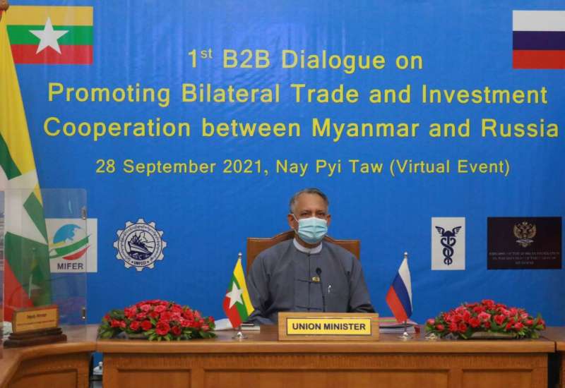 မြန်မာ-ရုရှား နှစ်နိုင်ငံအကြား ကုန်သွယ်မှုနှင့်ရင်းနှီးမြှုပ်နှံမှုများ ပိုမိုတိုးမြှင့်လာစေရန် ရည်ရွယ်၍ ပထမအကြိမ် မြန်မာ-ရုရှား စီးပွားရေးလုပ်ငန်းရှင်များ ဆွေးနွေးပွဲ (1st Business to Business Dialogue) ကို ယနေ့မွန်းလွဲ ၁ နာရီခွဲတွင် ရုံးအမှတ်(၁)၊ ရင်နှီးမြှုပ်နှံမှုနှင့် နိုင်ငံခြား စီးပွားဆက်သွယ်ရေးဝန်ကြီးဌာန၊ အစည်းအဝေးခန်းမ၌ Virtual စနစ်ဖြင့် ကျင်းပသည်။