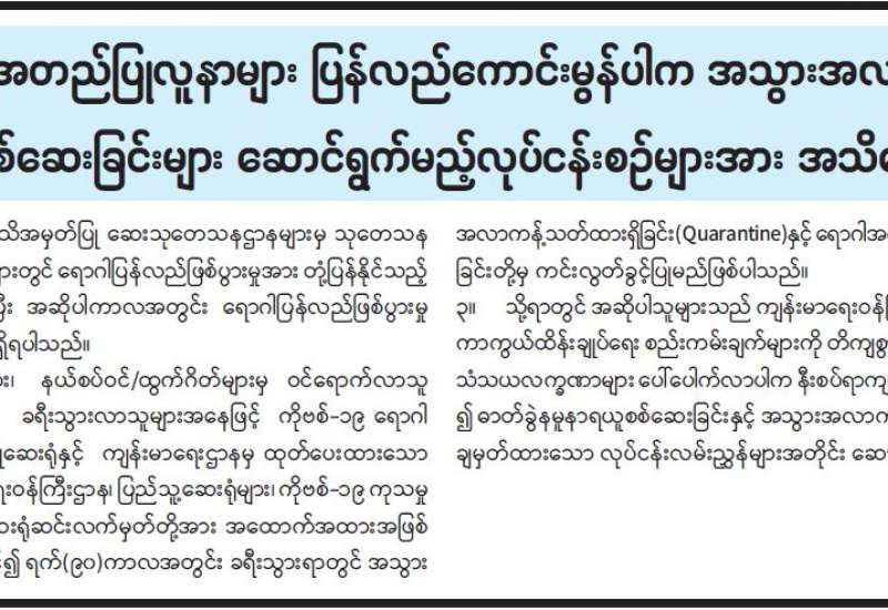 ကျန်းမာရေးဝန်ကြီးဌာနအနေဖြင့် နိုင်ငံအတွင်း ကူးစက်ဖြစ်ပွားနေသော COVID-19 ရောဂါ ကာကွယ်၊ ကုသ၊ ထိန်းချုပ်ရေးလုပ်ငန်းများကို အရှိန်အဟုန်မြှင့်ဆောင်ရွက်လျက်ရှိရာ ရောဂါ ထိန်းချုပ်ရေးလုပ်ငန်းများ အောင်မြင်နိုင်ရေးအတွက် ပြည်သူလူထုအနေဖြင့် ကျန်းမာရေး ဝန်ကြီးဌာနမှ ထုတ်ပြန်ထားသော COVID-19 ရောဂါ ကာကွယ်ထိန်းချုပ်ရေးဆိုင်ရာ စည်းကမ်းများ ကို စနစ်တကျ လိုက်နာဆောင်ရွက်ရန်လိုအပ်ပြီး COVID-19 ကာကွယ်ဆေးထိုးနှံမှုခံယူခြင်းအား အထူးဂရုပြု ပူးပေါင်းဆောင်ရွက်ကြရန်လိုအပ်ပါသည်။