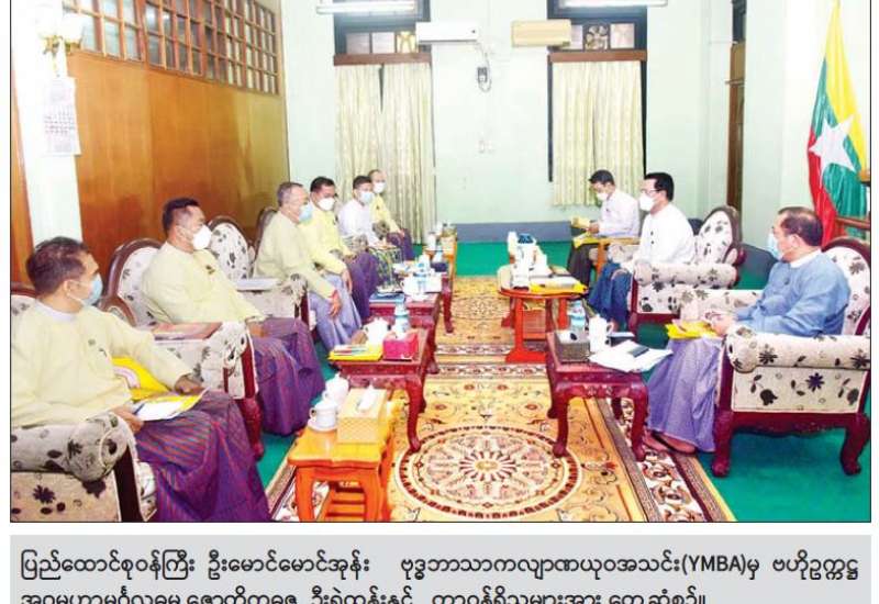 ပြန်ကြားရေးဝန်ကြီးဌာန ပြည်ထောင်စုဝန်ကြီး ဦးမောင်မောင်အုန်းသည် ယနေ့ နံနက်ပိုင်းတွင် ရန်ကုန်မြို့ သိမ်ဖြူလမ်းရှိ ပုံနှိပ်ရေးနှင့် ထုတ်ဝေရေး ဦးစီးဌာနဧည့်ခန်း၌ ဗုဒ္ဓဘာသာ ကလျာဏယုဝအသင်း(YMBA)မှ ဗဟိုဥက္ကဋ္ဌ အဂ္ဂမဟာမင်္ဂလဓမ္မ ဇောတိကဓဇ ဦးရဲထွန်းနှင့် တာဝန်ရှိသူများအား တွေ့ဆုံသည်။
