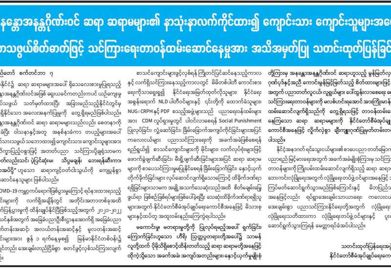 နိုင်ငံတော်စီမံအုပ်ချုပ်ရေးကောင်စီအနေဖြင့် မြန်မာနိုင်ငံအတွင်း ကိုဗစ်-၁၉ ရောဂါကာကွယ် ဟန့်တားနိုင်ရေးအတွက် ကာကွယ်ဆေးများ ရရှိရေးနှင့် ရောက်ရှိလာသော ကာကွယ် ဆေးများအား ပြည်သူလူထုထံအမြန်ဆုံး ရောက်ရှိထိုးနှံနိုင်ရေး အားသွန်ခွန်စိုက်ဆောင်ရွက်လျက်ရှိရာ NUG ၊ PDF အကြမ်းဖက်လုပ်ရပ်များနှင့် ၎င်းတို့မှ အခကြေးငွေပေးပြီးခိုင်းစေခံရသူများက အဆိုပါကာ ကွယ်ဆေး ထိုးနှံနေသူများကို နှောက်ယှက်တိုက်ခိုက်ခြင်း၊ မိုင်းထောင်ဗုံးခွဲခြင်းများ နေရာအနှံ့ဆောင်ရွက်လျက် ရှိသည်။