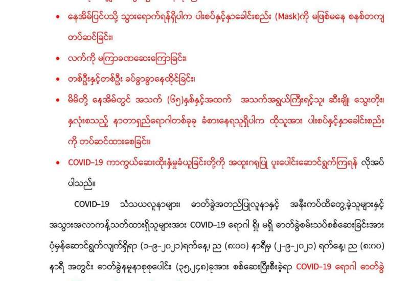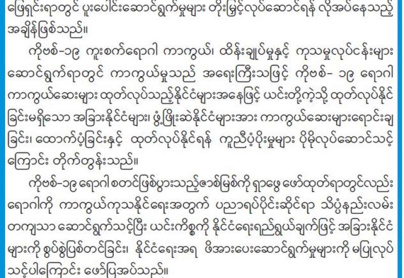 ကိုဗစ် -၁၉ ရောဂါ ကူးစက်ပျံ့နှံ့မှု ထိန်းချုပ်ရေးတွင် ကာကွယ်ဆေးထိုးနှံမှုက အရေးပါသည်။ မိမိတို့နိုင်ငံတွင် ယခုနှစ်အတွင်း လူဦးရေ၏ ၅၀ ရာခိုင်နှုန်း ထက်မနည်း ကာကွယ်ဆေး ထိုးနှံပေးနိုင်ရန်အတွက် ကြိုးပမ်းဆောင်ရွက်လျက်ရှိရာ နိုင်ငံတော်အစီအစဉ်ဖြင့် ကိုဗစ်-၁၉ ကာကွယ်ဆေး ဝယ်ယူခြင်းနှင့် လှူဒါန်းမှုတို့မှ ရရှိသော ကာကွယ်ဆေးများကို ဦးစားပေး အစီအစဉ်အလိုက် ထိုးနှံပေးလျက်ရှိသည်။ တစ်ဖက်တွင်လည်း ပုဂ္ဂလိကဆေးဝါးလုပ်ငန်းရှင်များ၊ ဆေးရုံဆေးခန်း များ၊ လူမှုရေးအသင်းအဖွဲ့များကို နိုင်ငံတကာနှင့်အာရှတွင် ထိုးနှံနေသည့် အရည်အသွေး အာနိသင်ရှိပြီး ဘေးအန္တရာယ် ကင်းရှင်းသည့် ကိုဗစ်-၁၉ ရောဂါ ကာကွယ်ဆေးများ တင်သွင်းဖြန့်ဖြူးခြင်း၊ ကာကွယ်ဆေးထိုးနှံခြင်းတို့ကို ဆောင်ရွက်ခွင့်ပြုခဲ့သည်။ ကိုဗစ်-၁၉ ရောဂါ ကာကွယ်ဆေး တင်သွင်း ဖြန့်ဖြူးခြင်းနှင့် ထိုးနှံပေးခြင်း ဆောင်ရွက်ရာတွင် လိုက်နာရမည့် အချက်များကိုလည်း ချမှတ်ပေးခဲ့သည်။