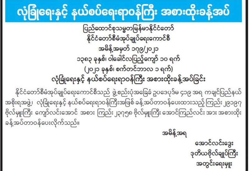 ရန်ကုန်မြို့တော် စည်ပင်သာယာရေးကော်မတီ၊ ကိုဗစ်-၁၉ ကာကွယ်၊ ထိန်းချုပ်၊ ကုသရေးကော်မတီသို့ သတ္တမအကြိမ် အလှူငွေပေးအပ်ပွဲ အခမ်းအနားကို ယနေ့နံနက် ၉ နာရီက ရန်ကုန်မြို့တော် စည်ပင် သာယာရေးကော်မတီ မြို့တော်ခန်းမ၌ ကျင်းပသည်။