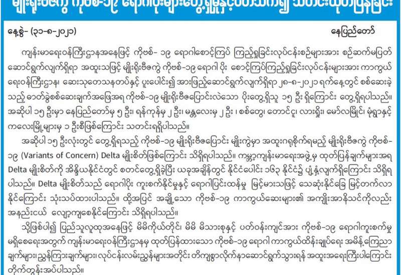 ကမ္ဘာ့ကျန်းမာရေးအဖွဲ့၏ ထုတ်ပြန်ချက်များအရ ဒယ်လ်တာမျိုးစိတ်ကို အိန္ဒိယနိုင်ငံတွင် စတင်တွေ့ရှိခဲ့ပြီး ယခုအချိန်အခါတွင် နိုင်ငံပေါင်း ၁၆၃ နိုင်ငံ၌ ပျံ့နှံ့ လျက်ရှိကြောင်းသိရသည်။ ဒယ်လ်တာမျိုးစိတ်သည် ရောဂါပိုးကူးစက်နိုင်မှုနှင့် ရောဂါပြင်းထန်မှု မြင့်မားသဖြင့် သေဆုံးနိုင်ခြေ မြင့်တက်လာနိုင်ကြောင်း သုံးသပ် ထားသည်။ ထို့အပြင် အချို့သော ကိုဗစ်-၁၉ ကာကွယ် ဆေးများ၏ အကျိုးအာနိသင်ကိုလည်း အနည်းငယ်လျော့ကျစေနိုင်ခဲ့ကြောင်း အသိပေးထား သည်။