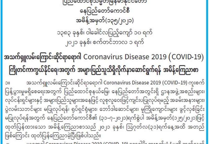 အကောက်ခွန်ဦးစီးဌာနအနေဖြင့် ကိုဗစ်-၁၉ ရောဂါ ကာကွယ်၊ ထိန်းချုပ်၊ ကုသရေးပစ္စည်းများအား လေကြောင်း၊ ဆိပ်ကမ်း၊ နယ်စပ်ဂိတ်အသီးသီးမှ ရုံးပိတ်ရက်ရှည်ကာလအတွင်း နေ့စဉ်ရုံးပိတ်ရက် မရှိ လွယ်ကူချောမွေ့စွာ စစ်ဆေးထုတ်ပေးလျက်ရှိသည်။