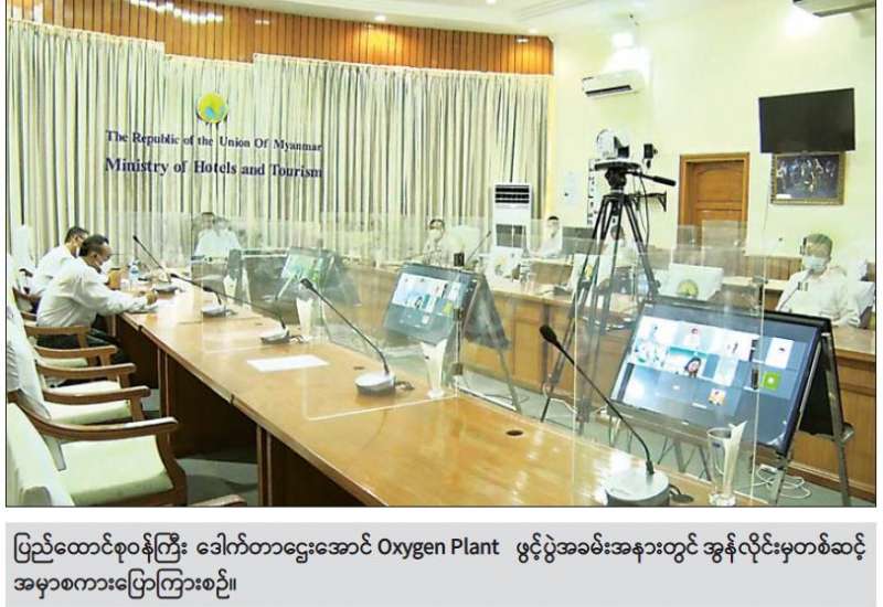 ဟိုတယ်နှင့်ခရီးသွားလာရေးဝန်ကြီးဌာန ပြည်ထောင်စုဝန်ကြီး ဒေါက်တာဌေးအောင်သည် ယနေ့နံနက်ပိုင်းတွင် ရန်ကုန်တိုင်းဒေသကြီး ဗိုလ်တထောင်မြို့နယ် အမှတ်(၃) ကုန်သည်လမ်းနှင့် စန္ဒကူးလမ်းထောင့်၌ တည်ဆောက်ထားသော Oxygen Plant ဖွင့်ပွဲအခမ်းအနားကို အွန်လိုင်းမှတစ်ဆင့် ပါဝင်တက်ရောက်၍ အဖွင့်အမှာစကား ပြောကြားသည်။