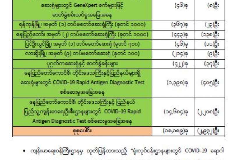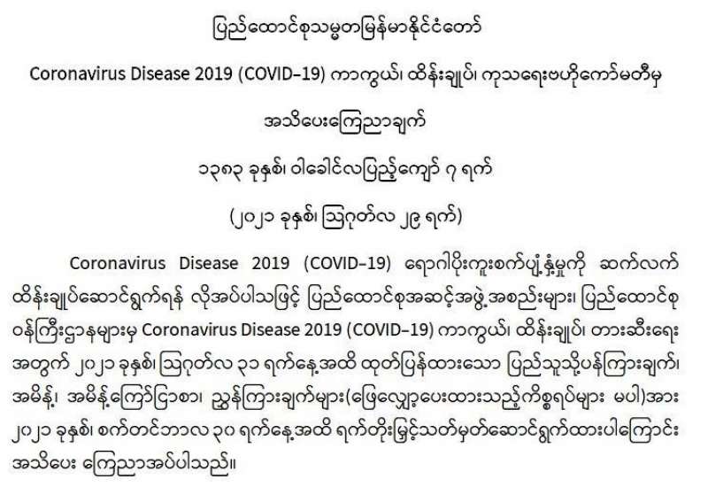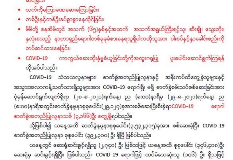 ကျန်းမာရေးဝန်ကြီးဌာနအနေဖြင့် နိုင်ငံအတွင်း ကူးစက်ဖြစ်ပွားနေသော COVID-19 ရောဂါ ကာကွယ်၊ ကုသ၊ ထိန်းချုပ်ရေးလုပ်ငန်းများကို အရှိန်အဟုန်မြှင့်ဆောင်ရွက်လျက်ရှိရာ ရောဂါ ထိန်းချုပ်ရေးလုပ်ငန်းများ အောင်မြင်နိုင်ရေးအတွက် ပြည်သူလူထုအနေဖြင့် -