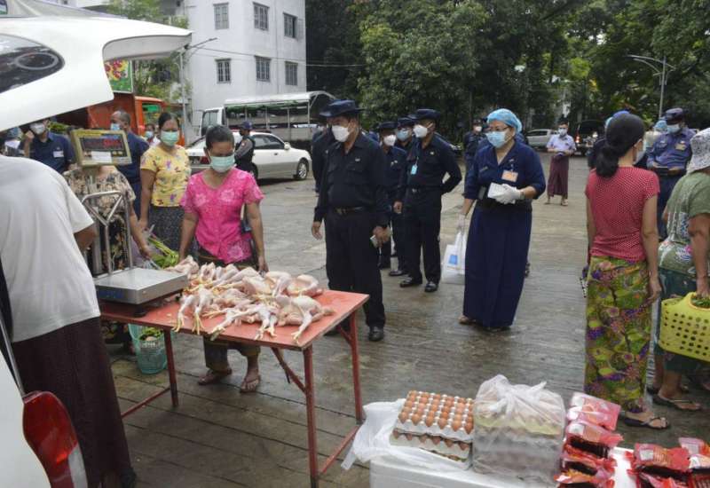 ရန်ကုန်တိုင်းဒေသကြီး စည်ပင်သာယာရေးဝန်ကြီး၊ ရန်ကုန်မြို့တော် စည်ပင်သာယာရေးကော်မတီ၊ ဥက္ကဋ္ဌ(မြို့တော်ဝန်) ဦးဗိုလ်ဌေးသည် ယနေ့နံနက် ၇ နာရီတွင် ဒဂုံမြို့နယ်၊ ရန်ကုန်တိုင်းဒေသကြီးအစိုးရအဖွဲ့ ဝန်ထမ်းအိမ်ရာဝင်း၌ မြို့ပြပတ်ဝန်းကျင် ထိန်းသိမ်းရေးနှင့် သန့်ရှင်းရေးဌာန၏ ကြီးကြပ်မှုဖြင့် ကုန်စိမ်းများ၊ မီးဖိုချောင်သုံး ကုန်ခြောက်မျိုးစုံ၊ အသား မျိုးစုံနှင့် ငါး/ပုဇွန် အမျိုးမျိုးတို့ကို ရွေ့လျားဈေးကား (Mobile Market) စနစ်ဖြင့် ရောင်းချနေမှု ကို ကြည့်ရှုစစ်ဆေးပြီး လိုအပ်သည်များ မှာကြားသည်။