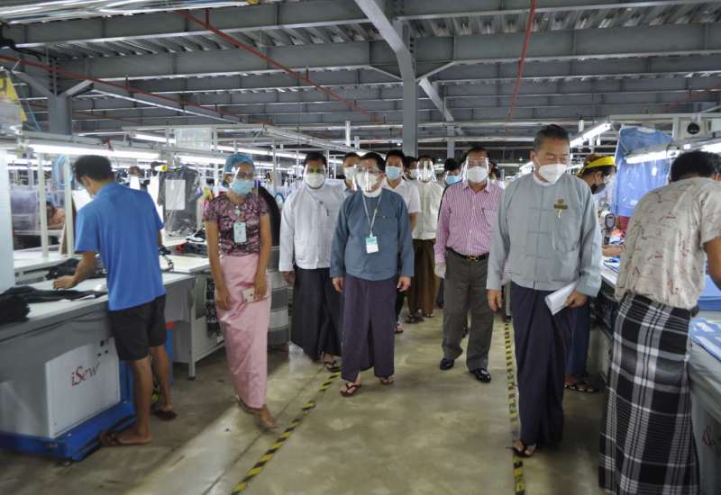 အလုပ်သမားဝန်ကြီးဌာန၊ ပြည်ထောင်စုဝန်ကြီး ဦးမြင့်ကြိုင်နှင့် ရန်ကုန်တိုင်းဒေသကြီး အစိုးရအဖွဲ့ ဝန်ကြီးချုပ် ဦးလှစိုးတို့သည် ယနေ့ နံနက်ပိုင်းတွင် ရန်ကုန်တိုင်းဒေသကြီး၊ လှိုင်သာယာ မြို့နယ်၊ ရွှေလင်ဗန်းစက်မှုဇုန်ရှိ Handa (Yangon) Garment Co., Ltd (အားကစားဝတ်စုံ ချုပ်လုပ်ငန်း) သို့ ရောက်ရှိပြီး ကိုဗစ်-၁၉ ရောဂါ ကာကွယ်ထိန်းချုပ်ရေးအတွက် ကျန်းမာရေး ဝန်ကြီးဌာနမှ ထုတ်ပြန်ထားသော စက်ရုံ၊ အလုပ်ရုံများဆိုင်ရာ လိုက်နာဆောင်ရွက်ရမည့် ညွှန်ကြားချက်များနှင့်အညီ ဆောင်ရွက်ထားရှိမှု၊ လုပ်ငန်းခွင်ဘေးအန္တရာယ် ကင်းရှင်းရေးနှင့် ကျန်းမာရေးဆိုင်ရာ လမ်းညွှန်ချက်များနှင့်အညီ ပြင်ဆင်ဆောင်ရွက်ထားရှိမှု အခြေအနေများကို လှည့်လည် ကြည့်ရှုစစ်ဆေးသည်။
