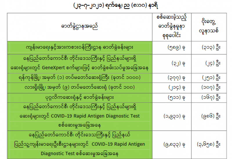 (၂၂-၇-၂၀၂၁) ရက်နေ့၊ ည (၈:၀၀) နာရီမှ (၂၃-၇-၂၀၂၁) ရက်နေ့၊ ည (၈:၀၀) နာရီအတွင်း ဓာတ်ခွဲနမူနာစုစုပေါင်း (၁၃,၄၈၇) ခုအား စစ်ဆေးပြီးစီးခဲ့ရာ COVID-19 ရောဂါ ဓာတ်ခွဲအတည်ပြု လူနာသစ် (၅,၅၀၆) ဦးတွေ့ရှိရပါသည်။ သို့ဖြစ်ပါ၍ ယနေ့အထိဓာတ်ခွဲ နမူနာစုစုပေါင်း (၃,၀၄၉,၁၆၃)ခု အား စစ်ဆေးခဲ့ပြီး COVID-19 ဓာတ်ခွဲအတည်ပြုလူနာ စုစုပေါင်း (၂၅၈,၈၇၀) ဦး ရှိပြီဖြစ်ပါသည်။