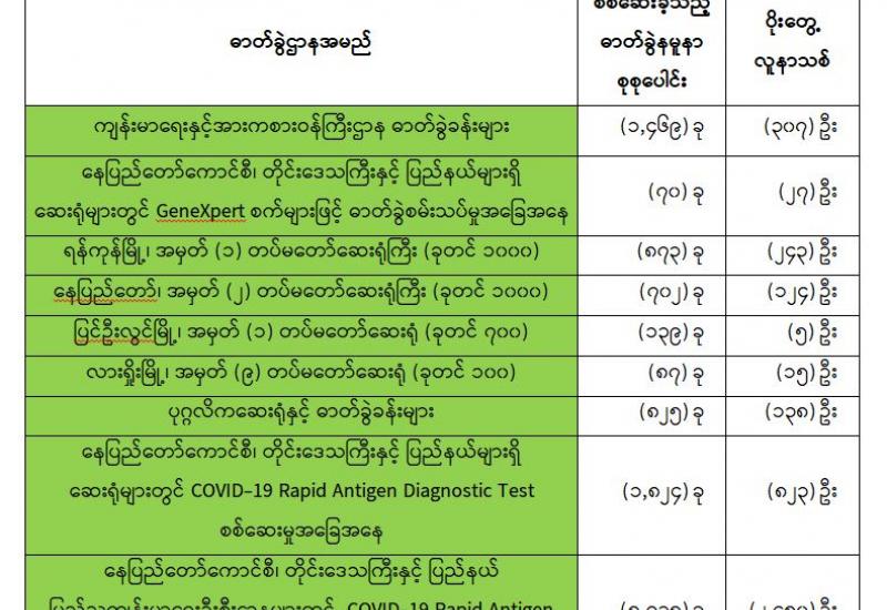(၇-၇-၂၀၂၁) ရက်နေ့၊ ည (၈:၀၀) နာရီမှ (၈-၇-၂၀၂၁) ရက်နေ့၊ ည (၈:၀၀) နာရီအတွင်း ဓာတ်ခွဲနမူနာစုစုပေါင်း (၁၄,၉၂၇) ခုအား စစ်ဆေးပြီးစီးခဲ့ရာ COVID-19 ရောဂါ ဓာတ်ခွဲအတည်ပြု လူနာသစ် (၄,၁၃၂) ဦး တွေ့ရှိရပါသည်။သို့ဖြစ်ပါ၍ ယနေ့အထိ ဓာတ်ခွဲနမူနာစုစုပေါင်း (၂,၈၂၅,၈၂၂)ခု အား စစ်ဆေးခဲ့ပြီး COVID-19 ဓာတ်ခွဲအတည်ပြုလူနာ စုစုပေါင်း (၁၈၀,၀၅၅) ဦး ရှိပြီ ဖြစ်ပါသည်။
