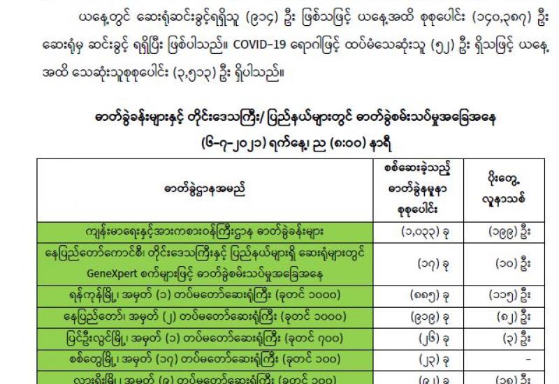 ပြည်သူလူထုအတွက် အဓိကအကျဆုံးဖြစ်သော ကျန်းမာရေးကဏ္ဍ မြင့်မား ရေးအတွက် တပ်မတော်မှ ပါရဂူများ၊ ဆေးမှူးများ၊ သူနာပြုများဖြင့် ဝိုင်းဝန်း ကူညီဆောင်ရွက်ပေးလျက် ရှိသည့်အပြင် ပြည်သူလူထု၏ အရေးပေါ် ကျန်းမာရေး ဆိုင်ရာကုသမှုများ ဆောင်ရွက် ပေးနိုင်ရန်အတွက် တပ်မတော်ဆေးရုံများနှင့် ယာယီကုသရေးဆေးရုံများ၌ ကျန်းမာရေး စောင့်ရှောက်မှုများကို နေ့ညမပြတ် ဆောင်ရွက်ပေးလျက်ရှိရာ ဖေဖော်ဝါရီ ၅ ရက်မှ ယနေ့အထိ ပြင်ပလူနာပေါင်း ၂၆၅၉၈၅ ဦးနှင့် အတွင်းလူနာပေါင်း ၇၇၃၀၆ ဦးတို့ကို ကုသပေးနိုင်ခဲ့သည်။