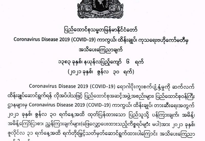 ပြည်ထောင်စုသမ္မတမြန်မာနိုင်ငံတော် Coronavirus Disease 2019 (COVID-19) ကာကွယ်၊ ထိန်းချုပ်၊ ကုသရေးဗဟိုကော်မတီမှ အသိပေးကြေညာချက်