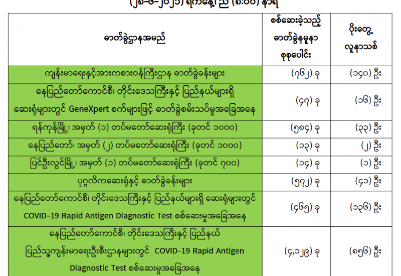 (၂၇-၆-၂၀၂၁) ရက်နေ့၊ ည (၈:၀၀) နာရီမှ (၂၈-၆-၂၀၂၁) ရက်နေ့၊ ည (၈:၀၀) နာရီအတွင်း ဓာတ်ခွဲနမူနာစုစုပေါင်း (၆,၅၈၆) ခုအား စစ်ဆေးပြီးစီးခဲ့ရာ COVID-19 ရောဂါ ဓာတ်ခွဲအတည်ပြု လူနာ သစ် (၁,၂၂၅) ဦး တွေ့ရှိရပါသည်။ သို့ဖြစ်ပါ၍ ယနေ့အထိ ဓာတ်ခွဲနမူနာ စုစုပေါင်း (၂,၇၁၈,၁၇၀) ခု အား စစ်ဆေးခဲ့ပြီး COVID-19 ဓာတ်ခွဲအတည်ပြုလူနာ စုစုပေါင်း (၁၅၄,၃၈၅) ဦး ရှိပြီ ဖြစ်ပါသည်။