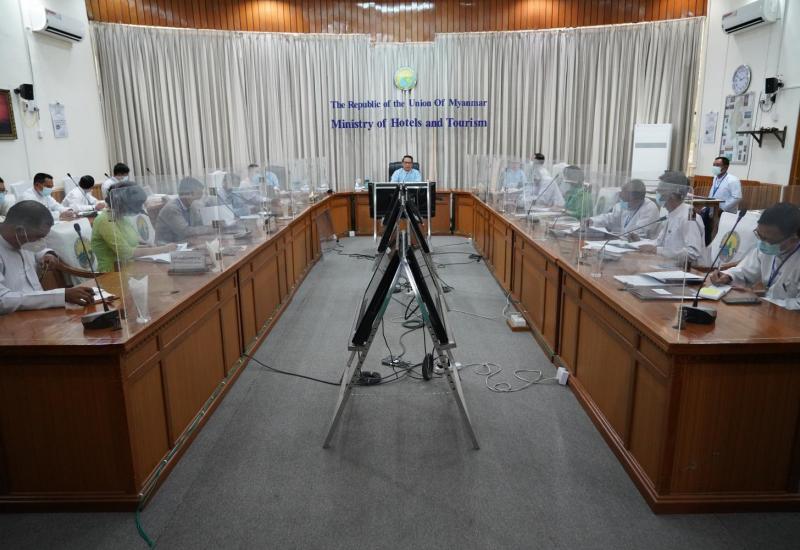 ဟိုတယ်နှင့်ခရီးသွားလာရေးဝန်ကြီးဌာန၊ ပြည်ထောင်စုဝန်ကြီး ဦးမောင်မောင်အုန်းသည် ဝန်ထမ်းရေးရာ၊ ခရီးသွားလုပ်ငန်းဖွံ့ဖြိုးတိုးတက်ရေး၊ ကိုဗစ်-၁၉ ရောဂါ ကာကွယ်တားဆီးရေး စည်းမျဉ်းစည်းကမ်းများကို လိုက်နာဆောင်ရွက်ရန်နှင့် အမျိုးသား ခရီးသွားလုပ်ငန်းဖွံ့ဖြိုး တိုးတက်ရေးဗဟိုကော်မတီ ပထမအကြိမ်အစည်းအဝေး အောင်မြင်စွာ ကျင်းပနိုင်ရေး အပြီးသတ် စီစဉ်ဆောင်ရွက်ထားရှိမှုများနှင့် စပ်လျဉ်း၍ လုပ်ငန်းညှိနှိုင်း အစည်းအဝေးကို ယနေ့နံနက်ပိုင်းတွင် ဝန်ကြီးဌာန၊ နီလာအစည်းအဝေးခန်းမ၌ ကျင်းပသည်။