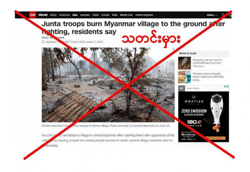၁၅−၆−၂၀၂၁ ရက်နေ့တွင်ဖြစ်ပွားသည့် မကွေးတိုင်းဒေသကြီး၊ ပေါက်မြို့နယ်၊ ကင်းမ ကျေးရွာ မီးလောင်မှု ဖြစ်စဉ်နှင့်ပတ်သက်၍ CNN နှင့် Reuters သတင်းဌာနများက ၎င်းကျေးရွာ မီးလောင်မှုတွင် လုံခြုံရေးတပ်ဖွဲ့ဝင်များက မီးရှို့ဖျက်ဆီးခဲ့သယောင် သတင်းမှားများ ရေးသား ဖော်ပြ၍ ၁၇−၆−၂၀၂၁ ရက်နေ့တွင် ၎င်းတို့၏ သတင်းစာမျက်နှာများတွင် ကျင့်ဝတ်သိက္ခာမဲ့စွာ ရေးသားဖော်ပြsခဲ့ပါသည်။