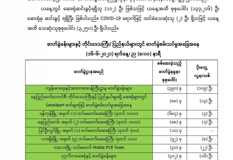 (၁၅-၆-၂၀၂၁) ရက်နေ့၊ ည (၈:၀၀) ောရီမှ (၁၆-၆-၂၀၂၁) ရက်နေ့၊ ည (၈:၀၀) ောရီအတွင်း ဓာတ်ခွဲေမူောစုစုနေါင်း (၃,၅၅၆) ခုအား စစ်နေးပေီးစီးခဲ့ရာ COVID-19 နရာဂါ ဓာတ်ခွဲအတည်ပေု လူောသစ် (၃၅၅) ဦး နတွ့ရှိရေါသည်။ သို့ဖြစ်ပါ၍ ယနေ့အထိ ဓာတ်ခွဲေမူော စုစုနပါင်း (၂,၆၅၇,၈၀၈) ခု အား စစ်နေးခဲ့ပပီး COVID-19 ဓာတ်ခွဲအတည်ဖပုလူော စုစုနပါင်း (၁၄၆,၄၀၆) ဦး ရှိပပီ ဖြစ်ပါသည်။