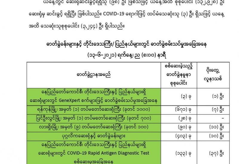 COVID-19 ရောဂါ ကာကွယ်၊ ထိန်းချုပ်ကုသရေးလုပ်ငန်းများ အရှိန်အအဟုန်မြှင့် ဆောင်ရွက် လျက်ရှိပြီး ရန်ကုန်တိုင်းစစ်ဌာနချုပ်နယ်မြေအတွင်းရှိ ကုသရေးဆေးရုံများ၌ ကျန်းမာရေး ဝန်ထမ်းများ မလုံလောက်မှုကြောင့် ထပ်မံဖွင့်လှစ်ထားရှိသည့် ရန်ကုန်တိုင်းဒေသကြီး၊ လှည်းကူးမြို့နယ် COVID-19 ရောဂါကုသရေးဌာန(ဖောင်ကြီး)တွင် တပ်မတော်မှ ပါဝင် ကူညီဆောင်ရွက်ရန်အတွက် ဆေးဝန်ထမ်းတပ်ဖွဲ့ဝင် ပါရဂူများ၊ ဆေးမှူးများ၊ သူနာပြုများ ပါဝင်သောအဖွဲ့က သွားရောက်တာဝန်ထမ်းဆောင်လျက်ရှိသည်။