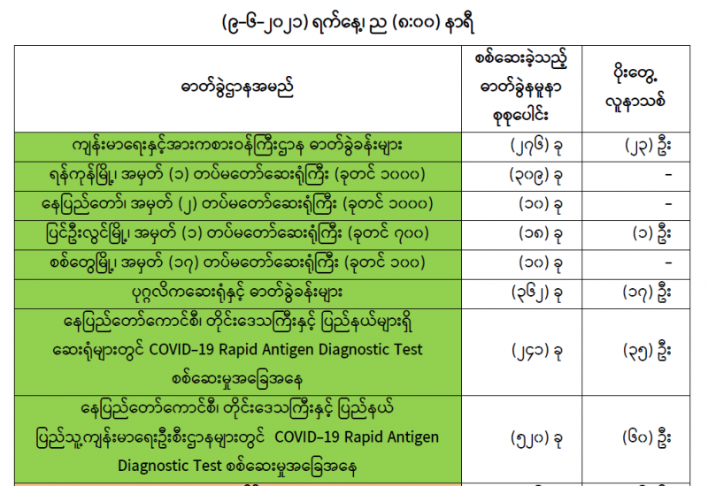 (၈-၆-၂၀၂၁) ရက်နေ့၊ ည (၈:၀၀) နာရီမှ (၉-၆-၂၀၂၁) ရက်နေ့၊ ည (၈:၀၀) နာရီအတွင်း ဓာတ်ခွဲနမူနာစုစုပေါင်း (၁,၇၄၆) ခုအား စစ်ဆေးပြီးစီးခဲ့ရာ COVID-19 ရောဂါ ဓာတ်ခွဲအတည်ပြု လူနာသစ် (၁၃၆) ဦး တွေ့ရှိရပါသည်။ သို့ဖြစ်ပါ၍ ယနေ့အထိ ဓာတ်ခွဲနမူနာ စုစုပေါင်း (၂,၆၃၆,၇၉၁) ခု အား စစ်ဆေးခဲ့ပြီး COVID-19 ဓာတ်ခွဲအတည်ပြုလူနာ စုစုပေါင်း (၁၄၄,၇၁၅) ဦး ရှိပြီ ဖြစ်ပါသည်။