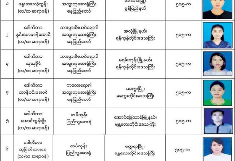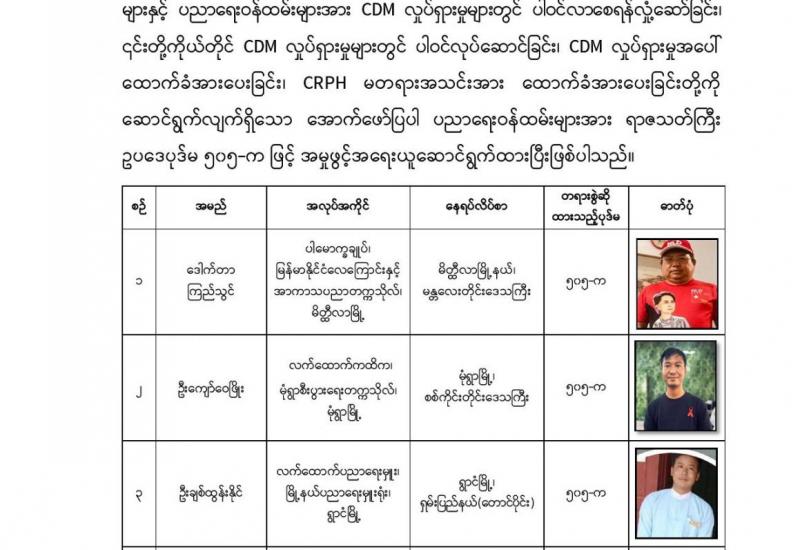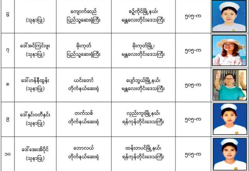 နိုင်ငံတော်၏ အုပ်ချုပ်မှုယန္တရားပျက်ပြားစေရန် ရည်ရွယ်ချက်ဖြင့် နိုင်ငံ့ဝန်ထမ်းနှင့် ကျန်းမာရေး ဝန်ထမ်းများအား CDM လှုပ်ရှားမှုများတွင် ပါဝင်လာစေရန် လှုံ့ဆော်ခြင်း၊ ၎င်းတို့ကိုယ်တိုင် CDM လှုပ်ရှားမှုများတွင် ပါဝင် လုပ်ဆောင် ခြင်း၊ CDM လှုပ်ရှားမှုအပေါ် ထောက်ခံအားပေးခြင်း၊ CRPH မတရား အသင်းအား ထောက်ခံ အားပေးခြင်း တို့ကို ဆောင်ရွက် လျက်ရှိသည့် အောက်ဖော်ပြပါ သူနာပြုများအား ရာဇသတ်ကြီးပုဒ်မ ၅၀၅-က ဖြင့် အမှုဖွင့် အရေး ယူဆောင်ရွက်ထားပြီး ဖြစ်ပါသည်။