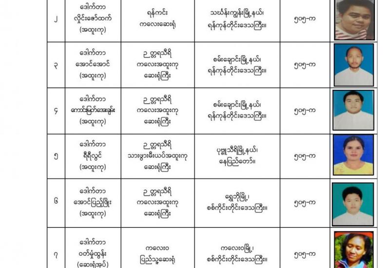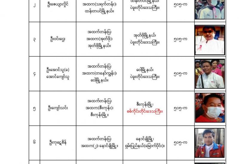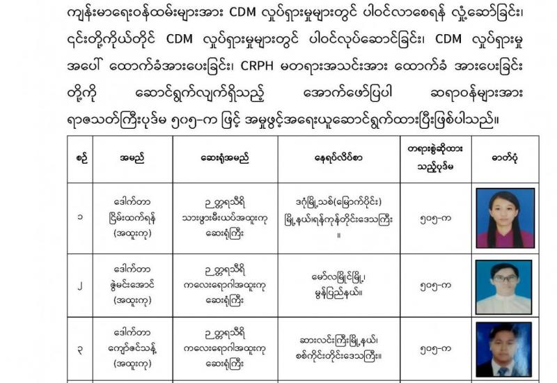 နိုင်ငံတော်၏ အုပ်ချုပ်မှုယန္တရားပျက်ပြားစေရန် ရည်ရွယ်ချက်ဖြင့် နိုင်ငံ့ဝန်ထမ်းနှင့် ကျန်းမာရေးဝန်ထမ်းများအား CDM လှုပ်ရှားမှုများတွင် ပါဝင်လာစေရန် လှုံ့ဆော်ခြင်း၊ ၎င်းတို့ကိုယ်တိုင် CDM လှုပ်ရှားမှုများတွင် ပါဝင် လုပ်ဆောင်ခြင်း၊ CDM လှုပ်ရှားမှု အပေါ် ထောက်ခံအားပေးခြင်း၊ CRPH မတရားအသင်းအား ထောက်ခံ အားပေးခြင်း တို့ကို ဆောင်ရွက်လျက်ရှိသည့် အောက်ဖော်ပြပါ ဆရာဝန်များအား ရာဇသတ်ကြီးပုဒ်မ ၅၀၅-က ဖြင့် အမှုဖွင့်အရေး ယူဆောင်ရွက် ထားပြီးဖြစ်ပါသည်။