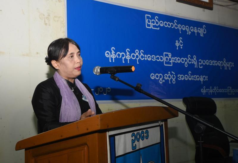 ပြည်ထောင်စုရှေ့နေချုပ်နှင့် ရန်ကုန်တိုင်းဒေသကြီးအတွင်းရှိ ဥပဒေအရာရှိများ တွေ့ဆုံပွဲကို ယနေ့နံနက် ၁၀ နာရီတွင် ရန်ကုန်တိုင်းဒေသကြီး ဥပဒေချုပ်ရုံး အစည်းအဝေးခန်းမ(၁)၌ ကျင်းပရာ ပြည်ထောင်စုရှေ့နေချုပ် ဒေါက်တာ သီတာဦးက ပြည်ထောင် စုရှေ့နေချုပ်ရုံးနှင့် အဆင့်ဆင့်သော ဥပဒေရုံးများ အရှိန်အဟုန်မပျက်စေရေး အဓိက တိုက်တွန်း အမှာစကား ပြောကြားသည်။
